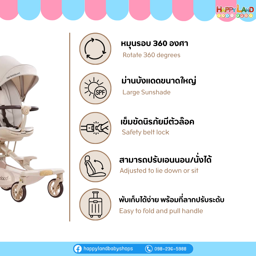 หมุนเบาะได้ 360 องศา: สามารถปรับทิศทางการเข็นได้ทั้งแบบหันหน้าเข้าหาพ่อแม่ หรือหันหน้าออกดูโลกภายนอก โดยไม่ต้องยกเบาะออก (ใช้ระบบหมุนที่ฐาน)