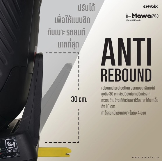 – และ Anti-Rebound ยังออกแบบมาพิเศษให้มีความสูงถึง 30 cm สามารถปรับได้ เพื่อให้แนบชิดกับเบาะมากที่สุด เพื่อป้องกันการบิดตัวของคาร์ซีทในการชนจากด้านข้าง