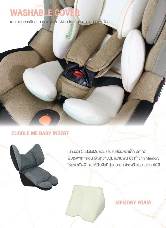 Washable cover: เบาะคลุมคาร์ซีทสามารถถอดซักได้ง่าย โดยไม่ต้องถอดสายเข็มขัด