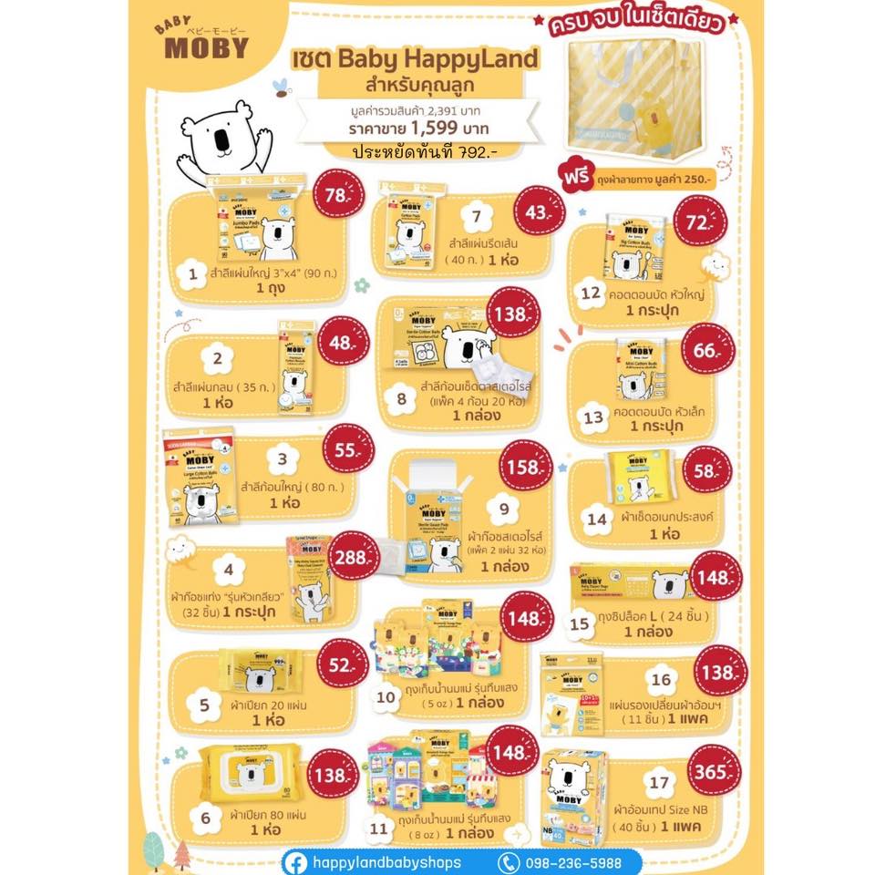 เบบี้ โมบี้ ผลิตภัณฑ์ประเภทสำลี เพื่อแม่และลูกน้อย มาในเซ็ท Super Save สุดคุ้ม! ประกอบด้วย 1.สำลีแผ่นใหญ่ 105 กรัม = 2 ถุง 2.สำลีแผ่นกลม 35 กรัม = 1 ถุง 3.สำลีก้อนใหญ่ 100 กรัม = 1 ถุง 4.ผ้าก๊อซชนิดแท่ง 32 ชิ้น = 1 กระปุก 5.ผ้าเปียก 80s = 2 ห่อ 6.คอตตอนบัตหัวเล็ก = 1 กระปุก 7.สำลีก้อนเช็ดตาสเตอไรท์ 1 กล่อง 8.ถุงเก็บน้ำนมแม่ 5 oz. = 1 กล่อง 9.ผ้าแห้ง = 1 ห่อ 10.ผ้าเปียก 20s = 3 ห่อ 11.คอตตอนบัตหัวใหญ่ 1 กระปุก 12.คอตตอนบัต หัวเล็ก / รีฟิว = 1 แพค 13.คอตตอนบัต หัวใหญ่ / รีฟิว = 1 แพค 14.ถุงซิปล็อค XL = 1 กล่อง 15.ถุงขยะ 1 กล่อง